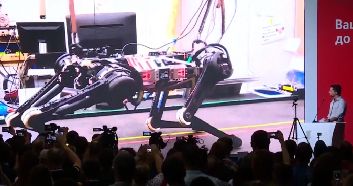 Зеленський також показав відео з випробування роботів американської інженерної компанії Boston Dynamics, після чого запропонував подивитися на українських чиновників.