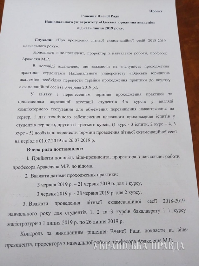 Проект рішення Вченої ради, який має в розпорядженні УП, був складений 22 травня (в документі помилково зазначено "22 липня").