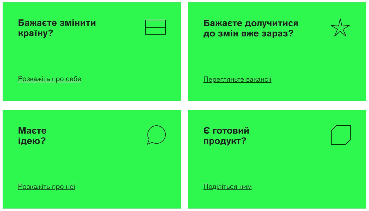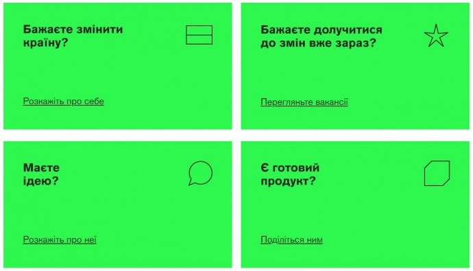 На сайті є можливість подивитися вакансії, розповісти про себе, розповісти про ідею, поділитися продуктом та подивитися Lift-трекер.