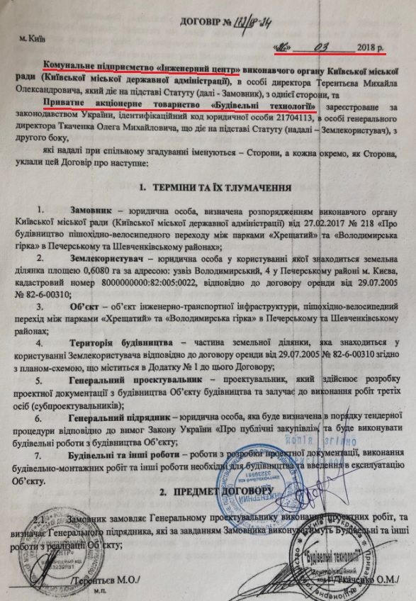 У березні 2018 року замовник будівництва мосту КП "Інженерний центр" КМДА підписав із підприємством "Будівельні технології" договір, завдяки якому будівництво мостового переходу стало можливим.