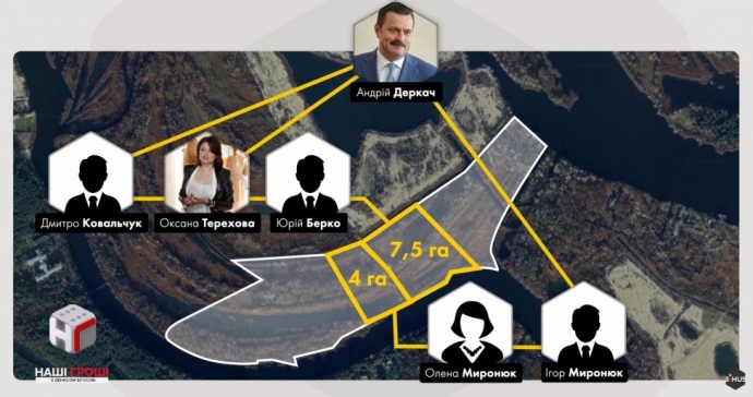 "Формально майже 42 гектари цієї дорогоцінної землі належать чотирьом особам. Троє з них мають міцні зв’язки з родиною нардепа Андрія Деркача. 7,5 гектар - в Юрія Берка. У нього спільний бізнес із дружиною Деркача Оксаною Тереховою і помічником Деркача Дмитром Ковальчуком", - йдеться у публікації.