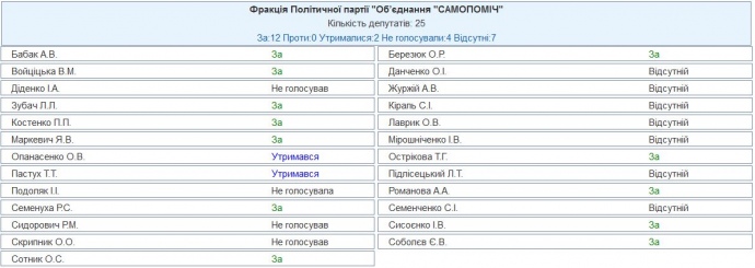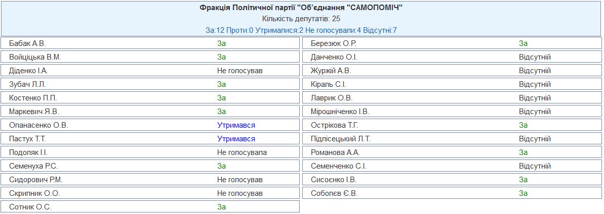 "Самопоміч" теж хотіла "відпустити" прем'єра. Тут результат голосування виглядає так: 12 – за, 0 – проти, 2 – утрималися, 4 – не голосували, 7 – відсутні.