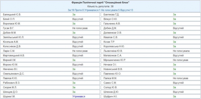 Депутати з "Опозиційного блоку" також переважно за відставку Гройсмана - 19 голосів за і 0 - проти. Не голосували 5, утримався 1 і 13 нардепів були відсутні.