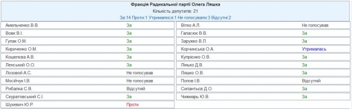 До прихильників відставки голови уряду приєдналася і фракція Олега Ляшка. 14 з 19 присутніх її членів підтримали відповідний проект постанови.