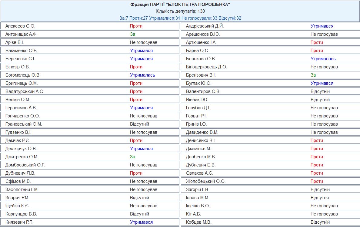 Фракція БПП була майже цілковито проти відставки голови уряду. Лише 7 її членів зі 130 підтримали проект постанови, 27 – проти, 31 - утримався, 33 - не голосували, 32 нардепи були відсутні.