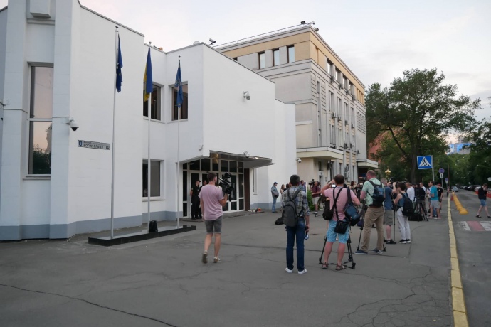 Перед дверима ВМС активісти написали балончиком "Вбивці", через що почалась штовханина.