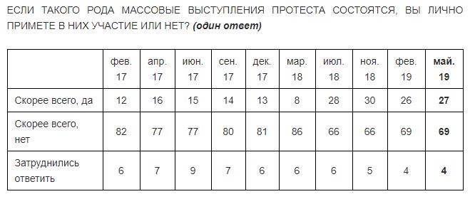 Разом з тим 69% опитаних вважають подібні акції малоймовірними, стільки ж опитаних жителів РФ не мають наміру брати в них участь.