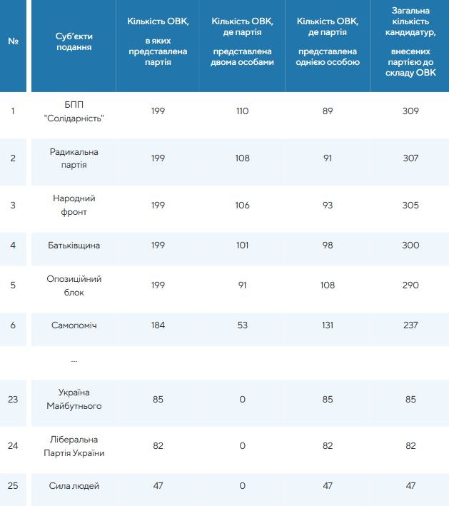 У цілому ж найбільше кандидатур до складу ОВК делегували "Блок Петра Порошенка "Солідарність" (309 осіб), "Радикальна партія Олега Ляшка" (307 осіб), "Народний фронт" (305 осіб), "Батьківщина" (300 осіб) і "Опозиційний блок" (290 осіб).