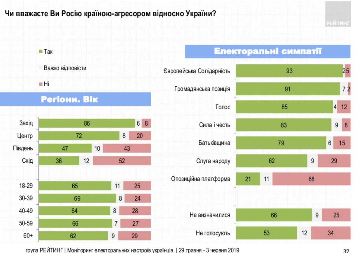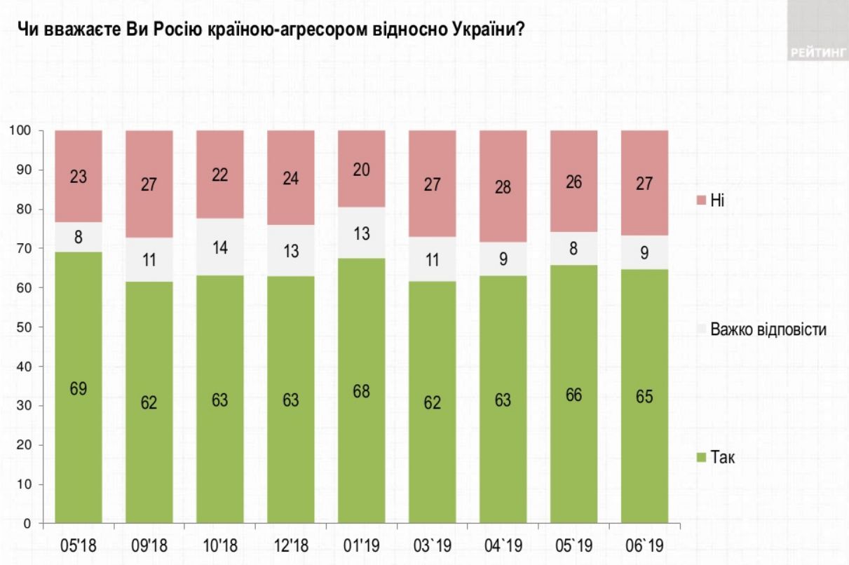 65% українців вважають Росію агресором щодо України, а 27% – протилежної думки.