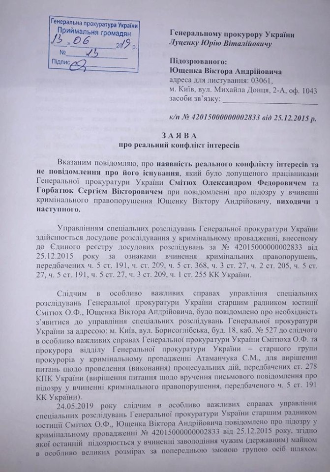 Ющенко зазначив, що згідно Закону України "Про запобігання корупції" слідчий Смітюх мав повідомити свого безпосереднього керівника Сергія Горбатюка про реальний конфлікт інтересів, а останній повинен був запобігти такому конфлікту при здійсненні досудового розслідування вказаних кримінальних проваджень.