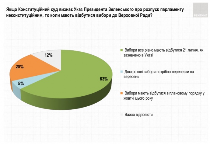 "63% (опитаних – ред.) вважають, що якщо Конституційний суд визнає указ президента В.Зеленського про розпуск парламенту неконституційним, то вибори до Верховної Ради все одно повинні відбутися 21 липня 2019 року, як зазначено у рішенні Глави держави", - сказано у повідомленні.