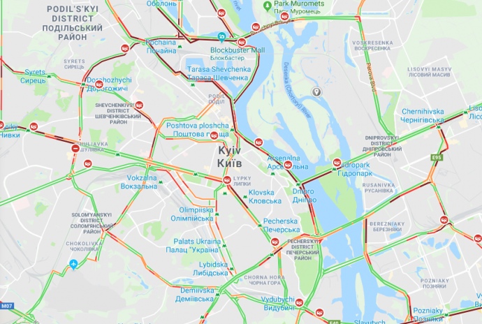 "Відповідно до позначок на мапі, "стоять" три мости, а також практично заблокований рух в районі метро "Хрещатик", "Поштова площа", "Контрактова площа", "Тараса Шевченка", "Університет", "Золоті Ворота", "Площа Льва Толстого", "Олімпійська", "Видубичі", "Дружби народів", - зазначає видання.