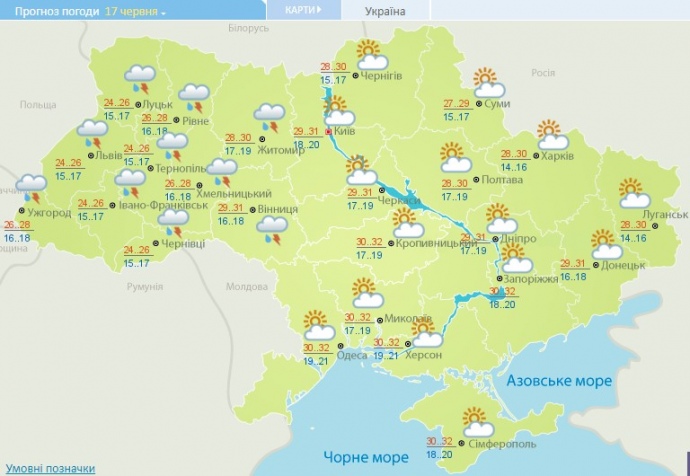 За прогнозами синоптиків, найближчими днями грози та дощі затримаються у західних областях, температура вдень дещо знизиться - до +24...+28. На решті території - без опадів, мінлива хмарність, повітря прогріється до +30...32 градусів.