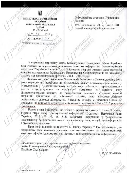 Зазначається, що агентство запросило у Міноборони інформацію про те, чи оголошувався в розшук Зеленський в зв'язку з тим, що він не з'явився до військкомату за повістками для призову по мобілізації 15 квітня 2014 року, 23 червня 2014 року, 15 серпня 2014 року, 10 травня 2015 року.