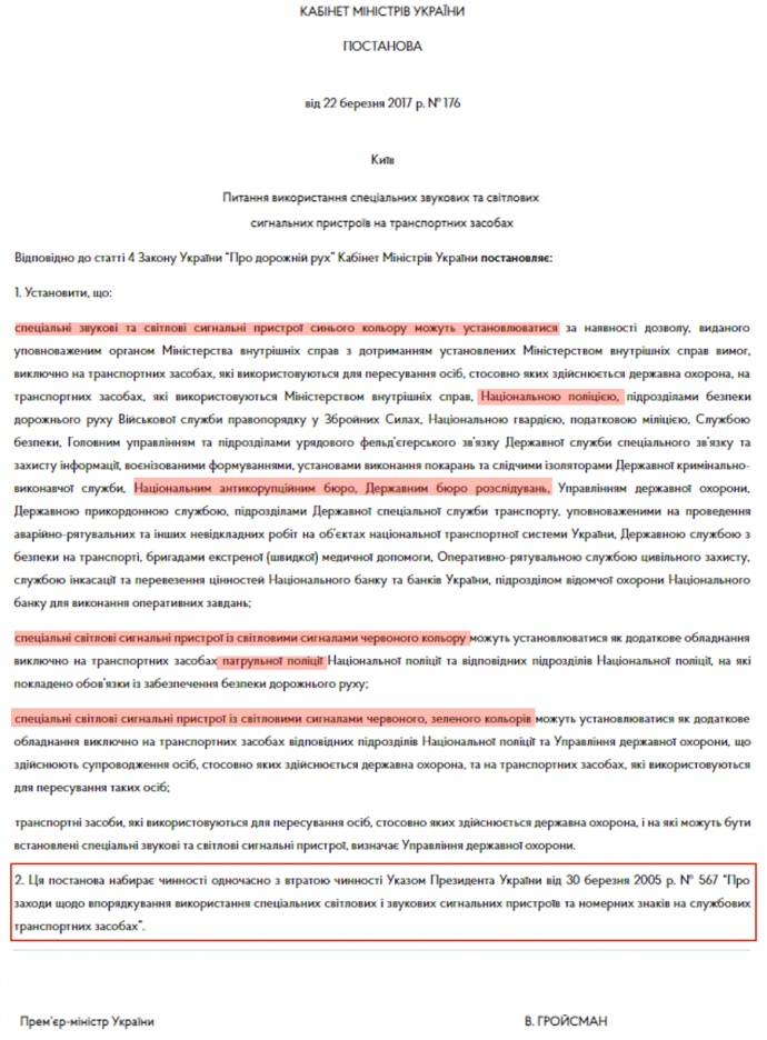 Разом з тим з моменту скасування указу Ющенка від 2005 року вступає в дію постанова Кабміну № 176 від 22 березня 2017 року, яка регламентує використання "маячків".