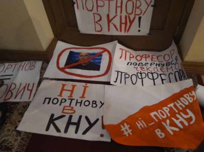 - Раніше через повернення Портнова до викладання у КНУ студенти, співробітники, викладачі та випускники університету висунули дві вимоги: скасування наказу про працевлаштування Портнова та публічне вибачення від ректора КНУ Леоніда Губерського за призначення Портнова.