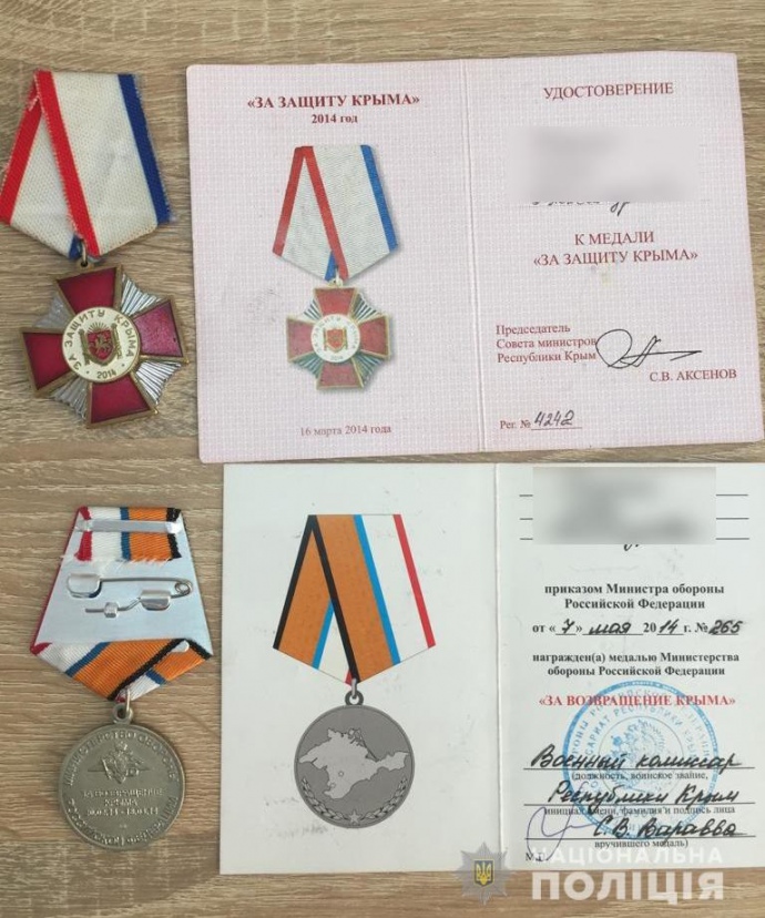 Затриманий має нагороди від окупаційної влади Криму - медалі "За защиту Крима" та "За возвращение Крыма".