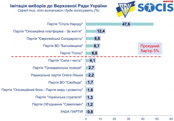 Так безперечним лідером із 47,6% підтримки (серед тих, хто визначився) залишається партія "Слуга народу".