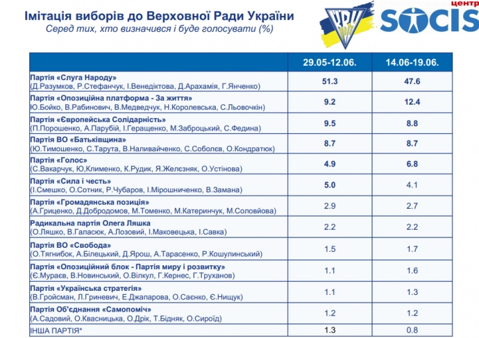 - Згідно з попереднім опитуванням "Социса" партію "Слуга народу" підтримували 51,3% громадян, подолала би бар’єр у 5% і партія екс-очільника СБУ Ігоря Смешка "Сила і честь".