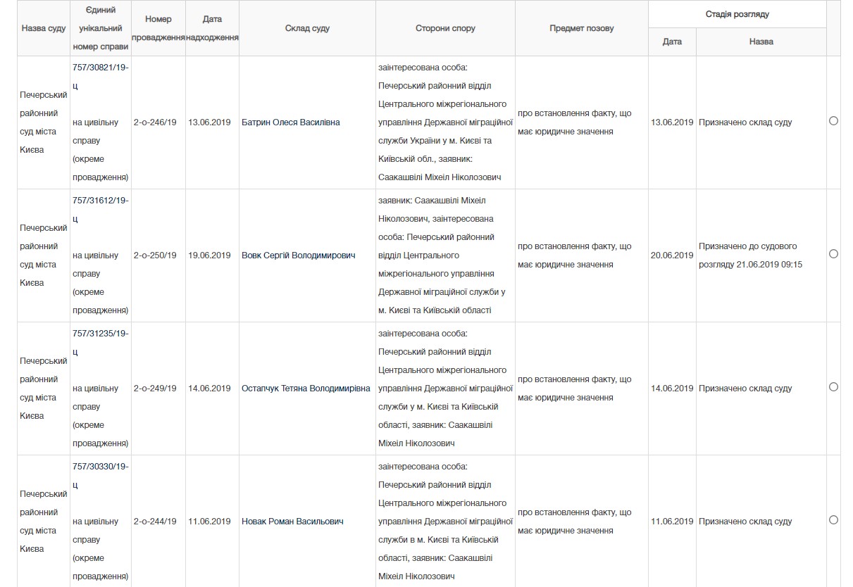 У всіх чотирьох позовах заявником є Саакашвілі, зацікавленою особою – Печерський районний відділ Центрального міжрегіонального управління Державної міграційної служби у м. Києві та Київській області. Предметом позовів вказане "встановлення факту, що має юридичне значення".
