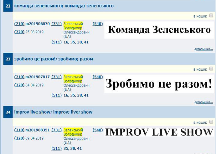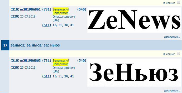 Крім того, серед ймовірних патентів Зеленського з’явились ТМ ZeNews і ЗеНьюз.