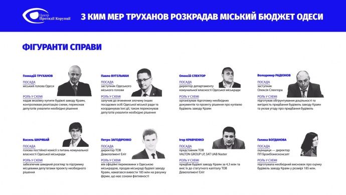 - Спочатку мера Одеси Геннадія Труханова, кількох посадовців міськради та підприємців звинувачували у заволодінні 185 мільйонами гривень з місцевого бюджету через купівлю будівлі збанкрутілого заводу "Краян" за завищеною вартістю, але пізніше суму "вкраденого" зменшили у два рази.