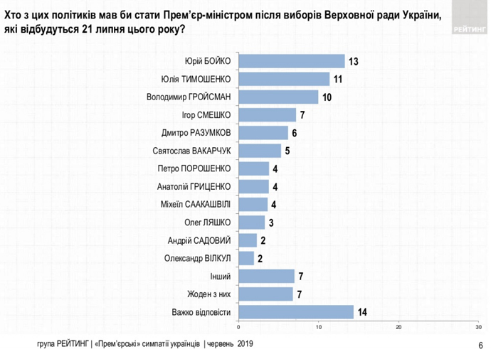 У червні, згідно з опитуванням КМІС, українці очікували побачити у кріслі прем’єра Юрія Бойка (12,9%), Юлію Тимошенко (11,3%) та Ігоря Смешка (8,1%).