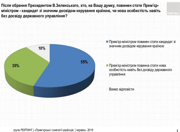 Разом з тим 55% вважають, що майбутнім прем’єр-міністром має стати кандидат зі значним досвідом керування країною, а 35% очікують нову особистість, навіть без досвіду державного управління.