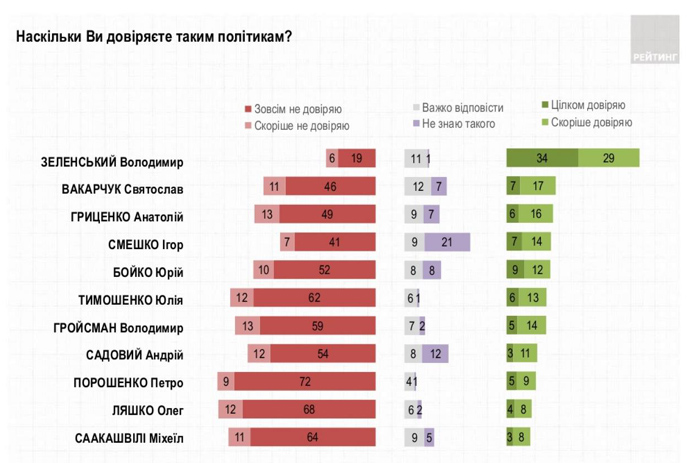 Президенту довіряє найбільший відсоток опитаних – 63%, не довіряють Зеленському - 25% опитаних. Наступний у рейтингу довіри співак Святослав Вакарчук, якому довіряють 24%, не довіряють Вакарчуку – 57%.