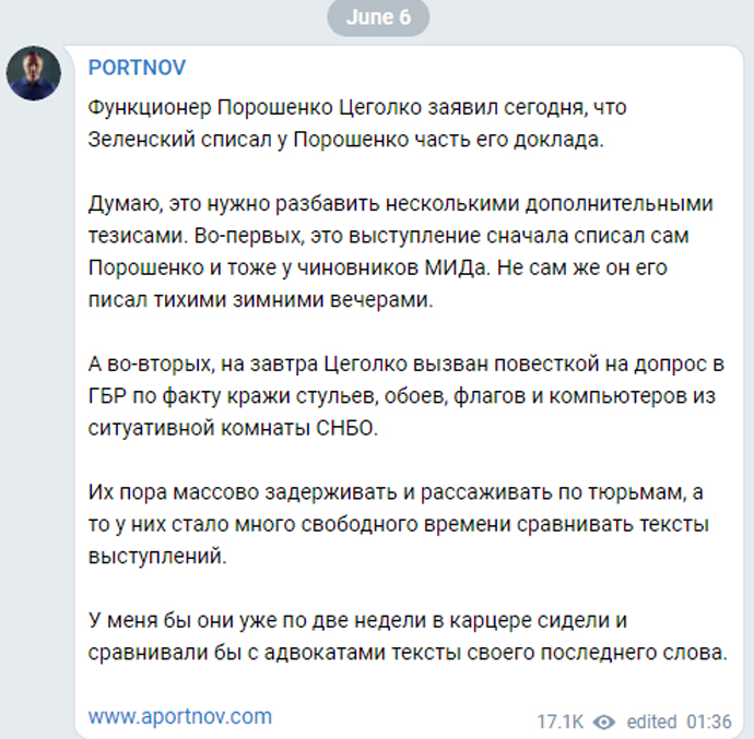 Про це Портнов повідомив у своєму telegram-каналі, реагуючи на звинувачення Цеголком президента Володимира Зеленського у плагіаті промови Порошенка.