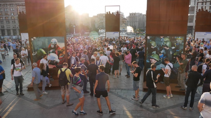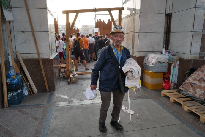Кілька активістів, не причетних до акції на Майдані, спробували витягти з-під стели до людей інсталяцію, яка перебувала там давно: імпровізовану шибеницю з портретом екс-президента Петра Порошенка у зашморзі.