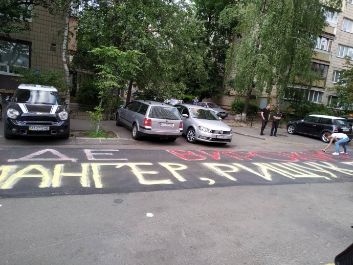 Під будівлею Генеральної прокуратури в Києві учасники акції "Хто замовив Катю Гандзюк?" балончиками з фарбою знову написали вимоги до ГПУ.
