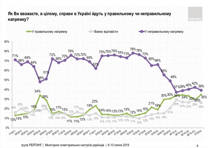 Про це свідчать результати опитування, проведеного Соціологічною групою "Рейтинг" 6-10 липня 2019 року, оприлюднені на сайті.