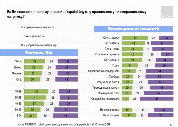 Зазначається, що найкраще оцінюють напрямок розвитку країни на Заході, найгірше – на Сході. Більш оптимістичною залишається молодь та виборці "Слуги народу".