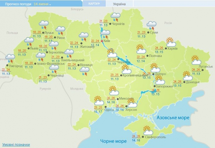14 липня – дощі з окремими грозами пройдуть на заході та півночі, на решті території – без істотних опадів.
