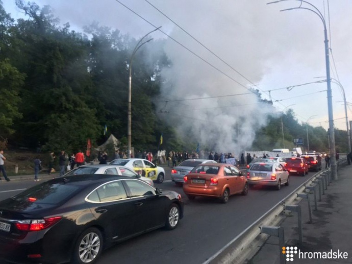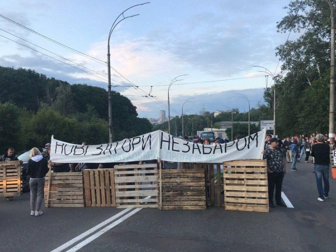 У Києві протестувальники проти забудови у Протасовому яру частково перекрили парканом проїжджу частину.