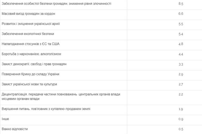 21,7% відповіли, що особисто для них важливим є "вирішення проблеми Донбасу", а 20% - "скорочення безробіття".