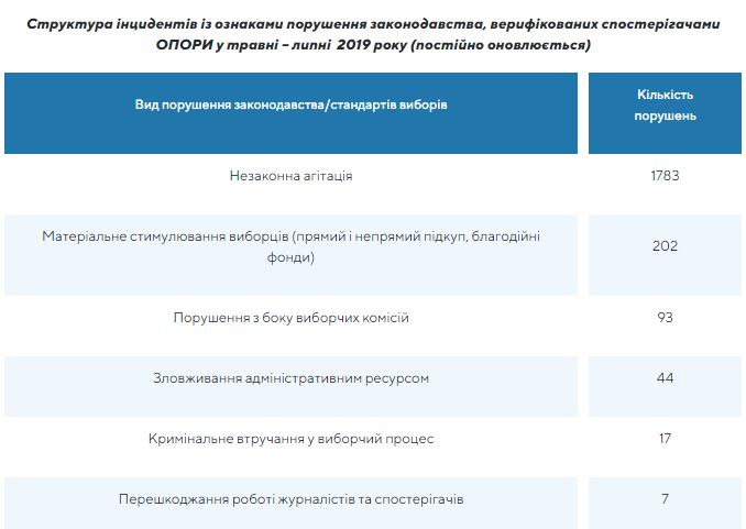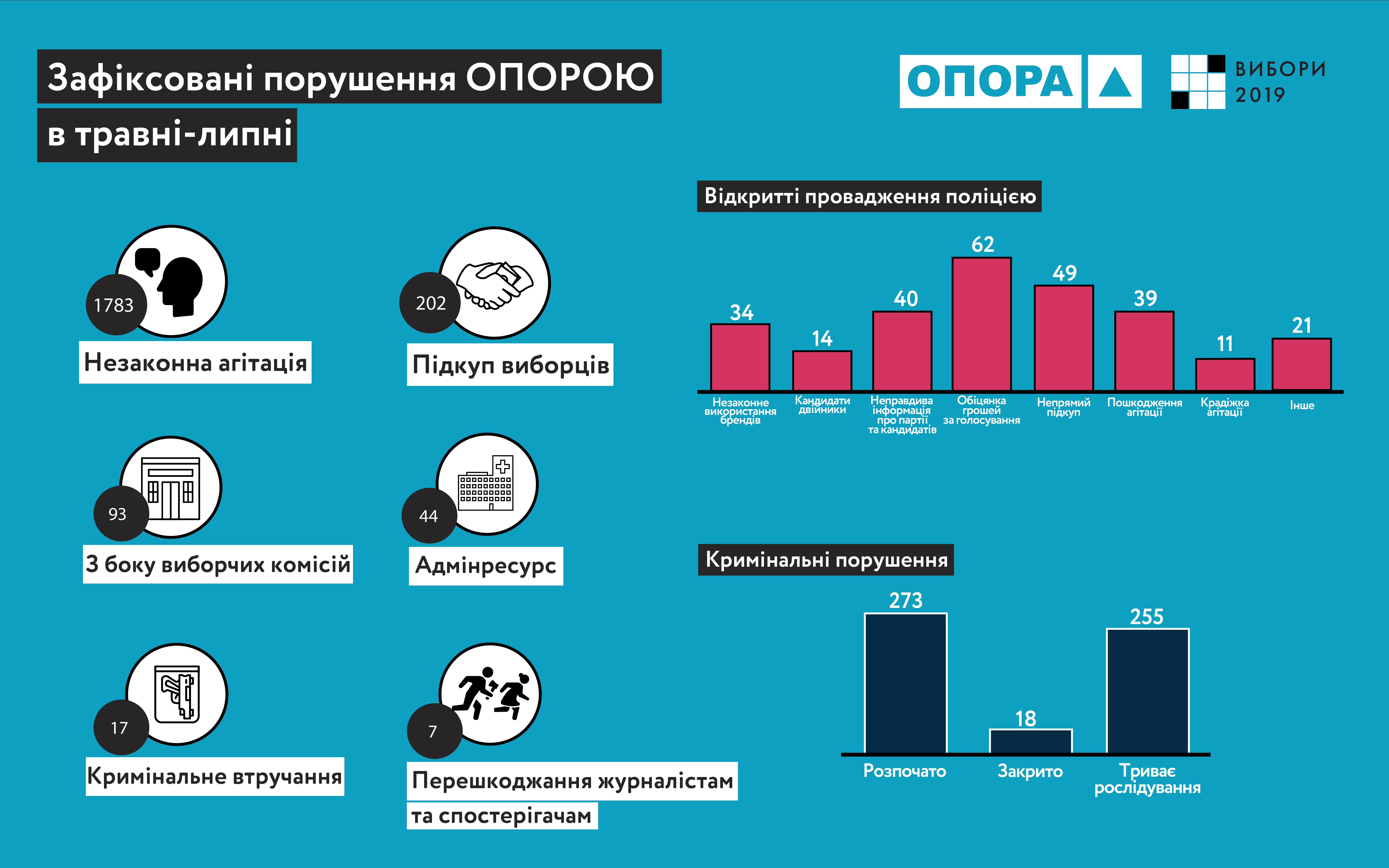 Протягом травня-липня 2019 року спостерігачі "Опори" виявили 2 147 інцидентів із ознаками порушення законодавства.