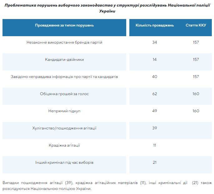 Зазначається, що Нацполіція станом на 18 липня розпочала 273 кримінальні провадження, з яких 111 – тобто 41% – стосуються грошового (62) або непрямого (49) підкупу виборців. 88 проваджень – про перешкоджання виборчому праву громадян шляхом обману.