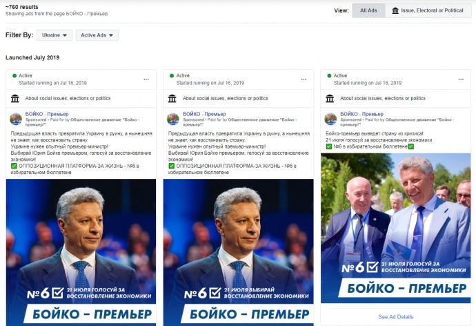 Із фан-сторінок найбільша кількість активних рекламних дописів станом на 12 годину 21 липня транслюється зі сторінки "Бойко – премьер", яка просуває Юрія Бойка та "Опозиційну платформу – За життя".