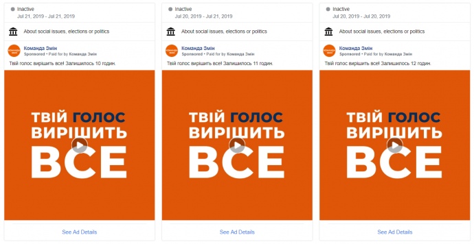 Станом на 12 годину 21 липня на сторінці "Слуги народу" транслюється 34 активні рекламні дописи.
