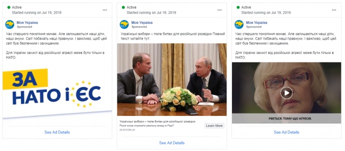 На користь партії "Європейська Солідарність" транслює дописи сторінка під назвою "Моя Україна". Впродовж кампанії вона також поширювала негативні дописи щодо Анатолія Гриценка, Ігоря Смешка та Святослава Вакарчука.
