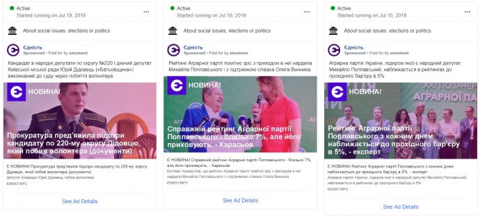 "Частина реклами транслюється із офіційних сторінок партій та мажоритарників, однак левова частка реклами транслюється із неофіційних фан-сторінок та сторінок, які транслюють антирекламу", - йдеться у тексті.