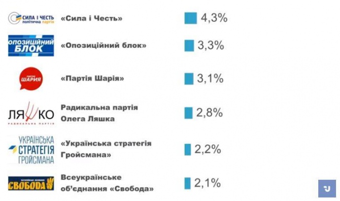 Найближче до 5-відсоткового прохідного бар'єру серед аутсайдерів перебуває партія "Сила і честь" – 4,3% голосів.