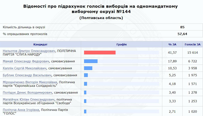Кандидат від "Слуги народу" підприємець Дмитро Нальотов випереджає колишнього міського голову Полтави Олександра Мамая та нардепа двох попередніх скликань Сергія Капліна на 144-му одномандатному виборчому окрузі у Полтавській області.