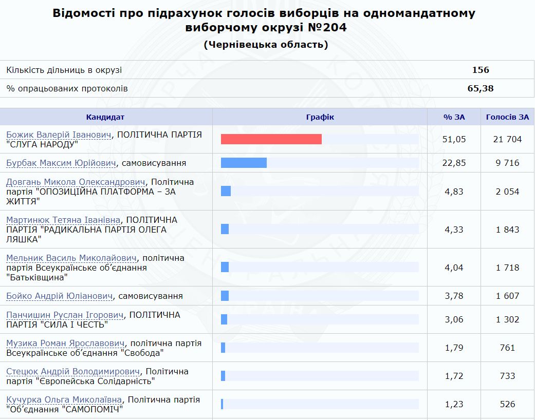 Максим Бурбак у окрузі №204 (Чернівецька область) за результатом опрацювання 65,38% протоколів отримав 22,85% підтримки і програв кандидату від "Слуги народу" Валерію Боджику, за якого проголосували 51,05% виборців Буковини.