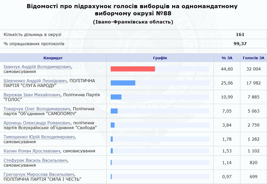 Андрій Іванчук в окрузі №88 (Івано-Франківська область) за результатом опрацювання 99,37% протоколів отримує перемогу з 44,6% голосів, а кандидат від партії президента "Слуга народу" Андрій Шевченко поступився йому з результатом 25,06% голосів.