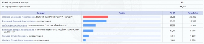 Лідирує на окрузі кандидат від "Слуги народу" Олександр Літвінов.