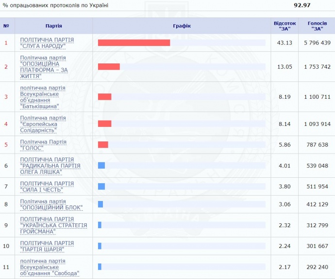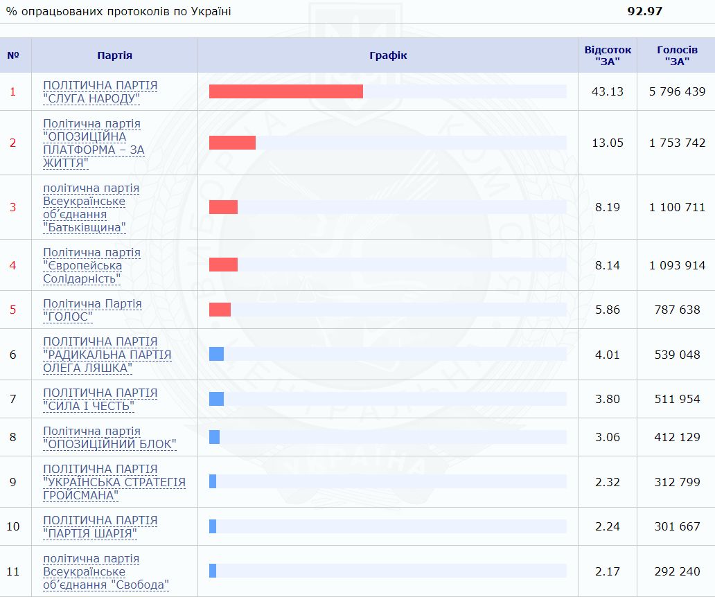 Прохідний бар’єр у 5% долають лише 5 партій: президентська на чолі з Дмитром Разумковим, сила Віктора Медведчука на чолі з Юрієм Бойком, політсили Юлії Тимошенко, Петра Порошенка і Святослава Вакарчука.