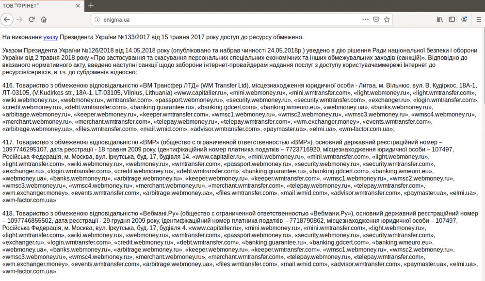 Крім порталу enigma.ua, суд закрив доступ до: go338.top, trident-ua.info, blogs.korrespondent.net, seychas.press, netadvocate.org, compromat.ws, compromat.ws, sled-net-ua, ua-24.com, moscow-post.press, novindoosh.com, stalker-world.net, rospres.press, informator.news, ustav.press, ukrpress.info.
